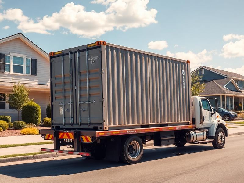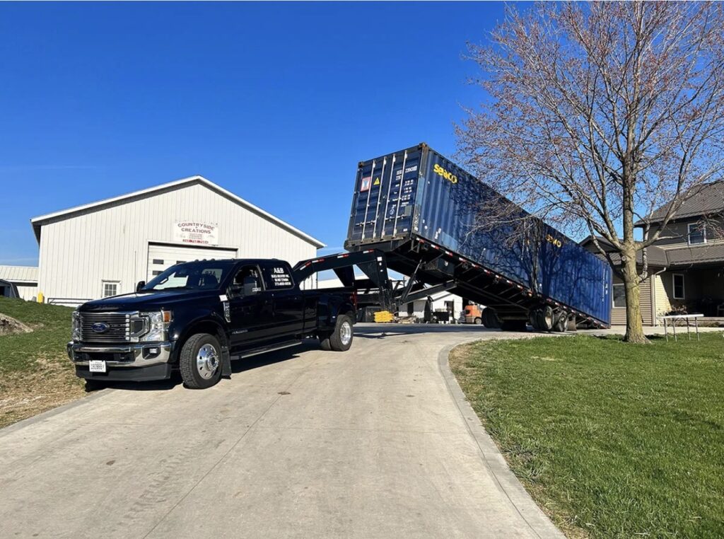 The most common method. The container slides off the back of a tilt-bed truck directly onto your property. Requires a flat, clear area.